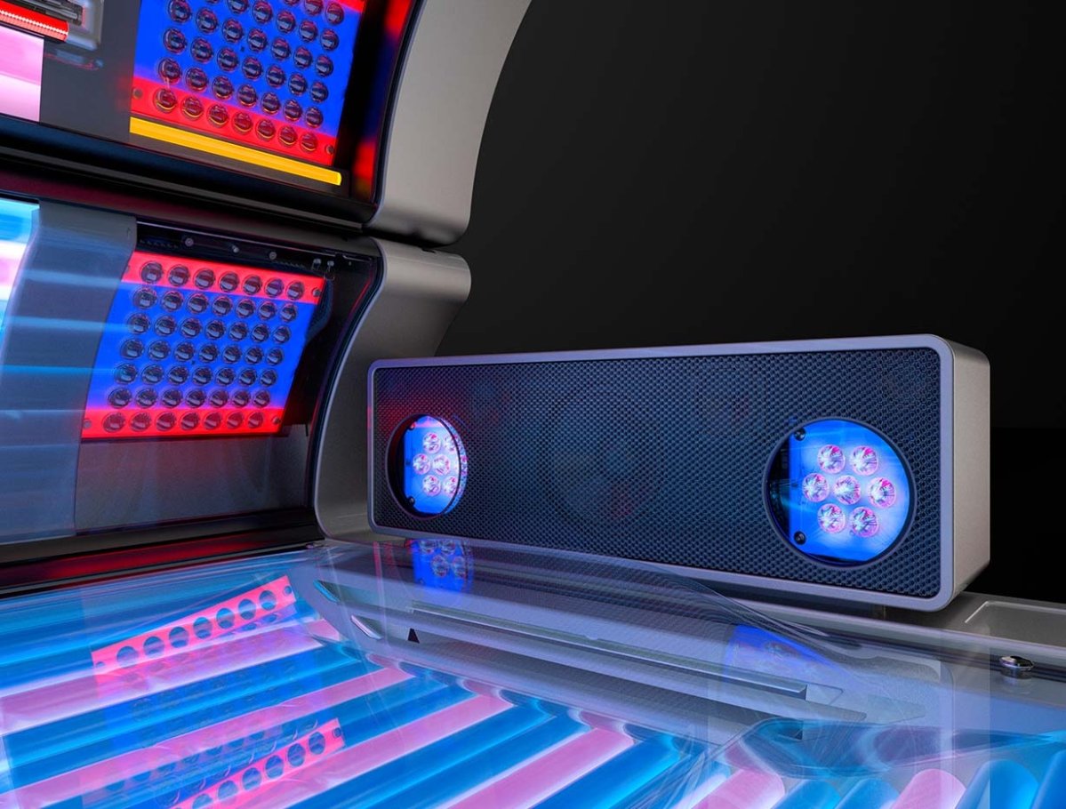 Die neuentwickelte 3D Soundbar der K-Modelle bringt räumlichen Klang mit kristallklaren Höhen, kraftvollen Mitten und satten Bässen in den Besonnungs-Tunnel, optimal gesteuert durch einen digitalen Soundprozessor. Solarien-Nutzer wählen zwischen Musik oder erstmals auch Entspannungsklängen. Per Bluetooth lassen sich zusätzlich auch eigene Musik-Bibliotheken abspielen.