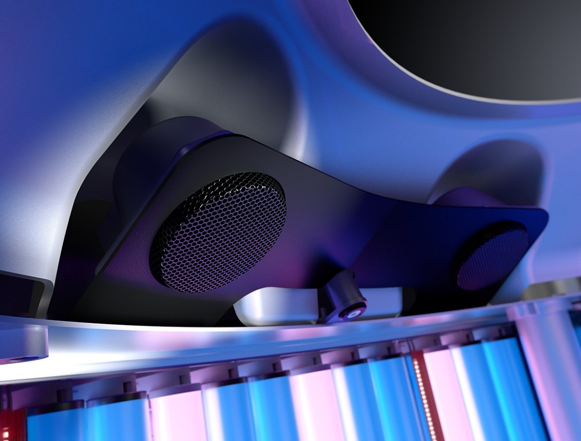 Die neuentwickelte 3D Soundbar der T-Modelle bringt räumlichen Klang mit kristallklaren Höhen, kraftvollen Mitten und satten Bässen mit sich, optimal gesteuert durch einen digitalen Soundprozessor. Solarien-Nutzer wählen zwischen Musik oder erstmals auch Entspannungsklängen. Per Bluetooth lassen sich zusätzlich auch eigene Musik-Bibliotheken abspielen.