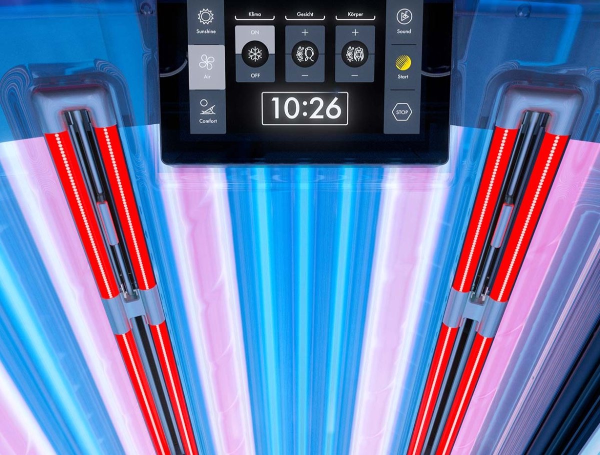 Mit AirBreeze werden neue Standards in der Lüftungs-Technologie bei Solarien gesetzt. Die separat einstellbare Intensität für Körper und Gesicht schmiedet sich an jeden Körper an. Im Bereich von Gesicht und Dekolleté lassen sich die Luftstöme zudem lenken.