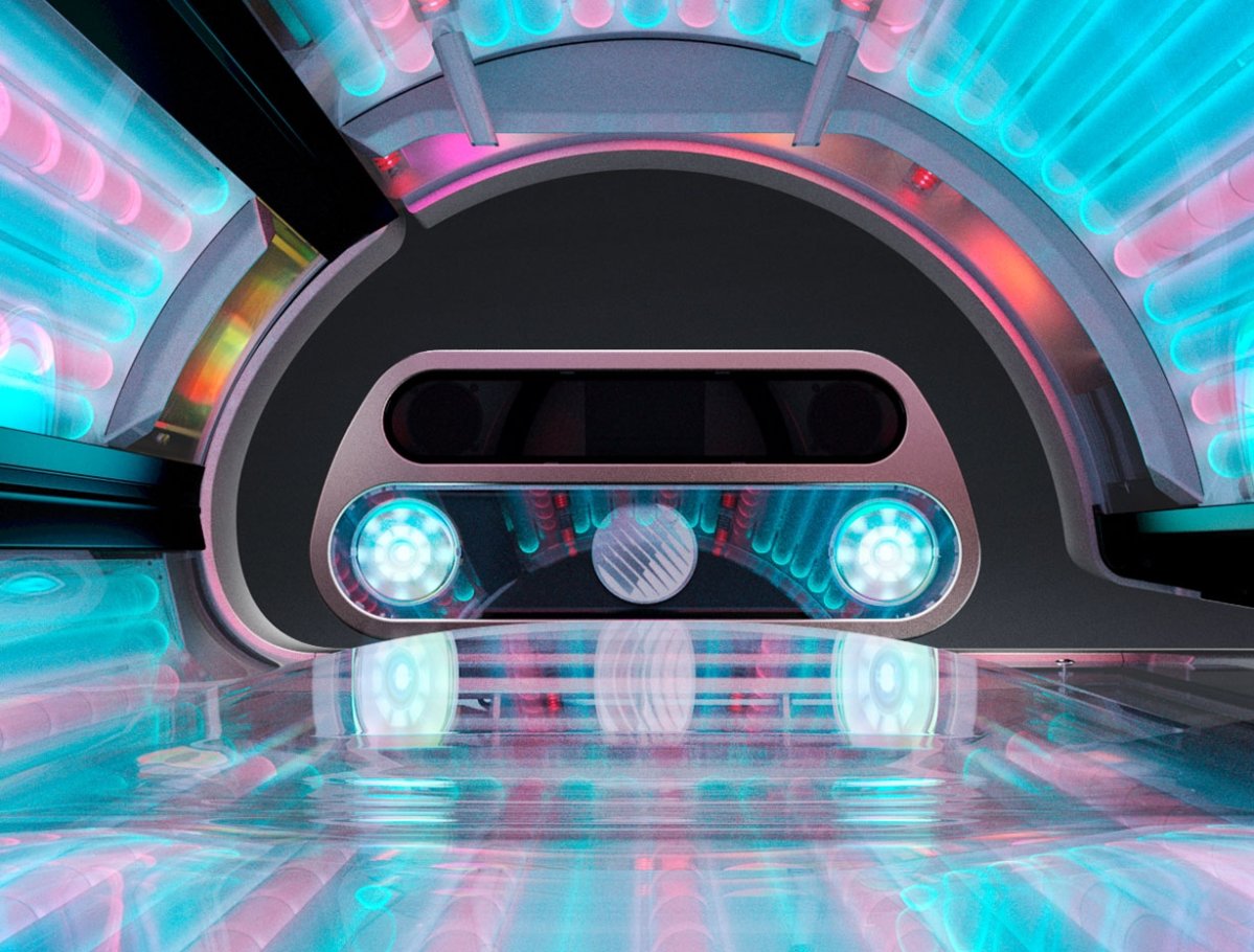 Gleichmäßige und intensive Besonnung im Schulterbereich durch moderne Hochdrucksysteme mit Filterscheiben und Refektoren aus Glas.