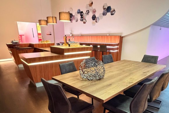 In unserem Essbereich wird gegessen, auch gefeiert – und das mitten im Herzen unseres Ausstellungsraums.